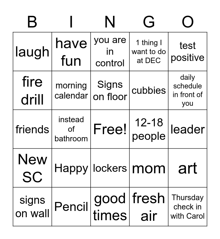 This bingo card has a free space and 24 words: Happy, Pencil, Signs on floor, signs on wall, test positive, laugh, fire drill, have fun, 12-18 people, lockers, cubbies, friends, mom, art, morning calendar, fresh air, leader, you are in control, daily schedule in front of you, instead of bathroom, Thursday check in with Carol, New SC, 1 thing I want to do at DEC and good times.