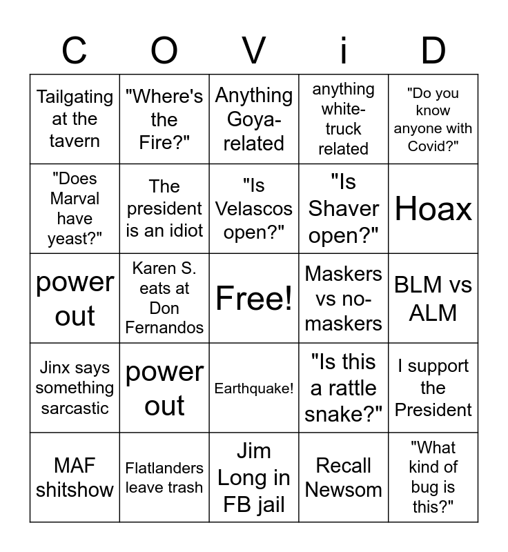 This bingo card has a free space and 24 words: power out, Flatlanders leave trash, "Is Velascos open?", MAF shitshow, "Do you know anyone with Covid?", Tailgating at the tavern, "Does Marval have yeast?", "Where's the Fire?", Maskers vs no-maskers, Earthquake!, "Is Shaver open?", power out, "Is this a rattle snake?", I support the President, The president is an idiot, Recall Newsom, BLM vs ALM, Anything Goya-related, Hoax, Karen S. eats at Don Fernandos, "What kind of bug is this?", Jinx says something sarcastic, anything white-truck related and Jim Long in FB jail.