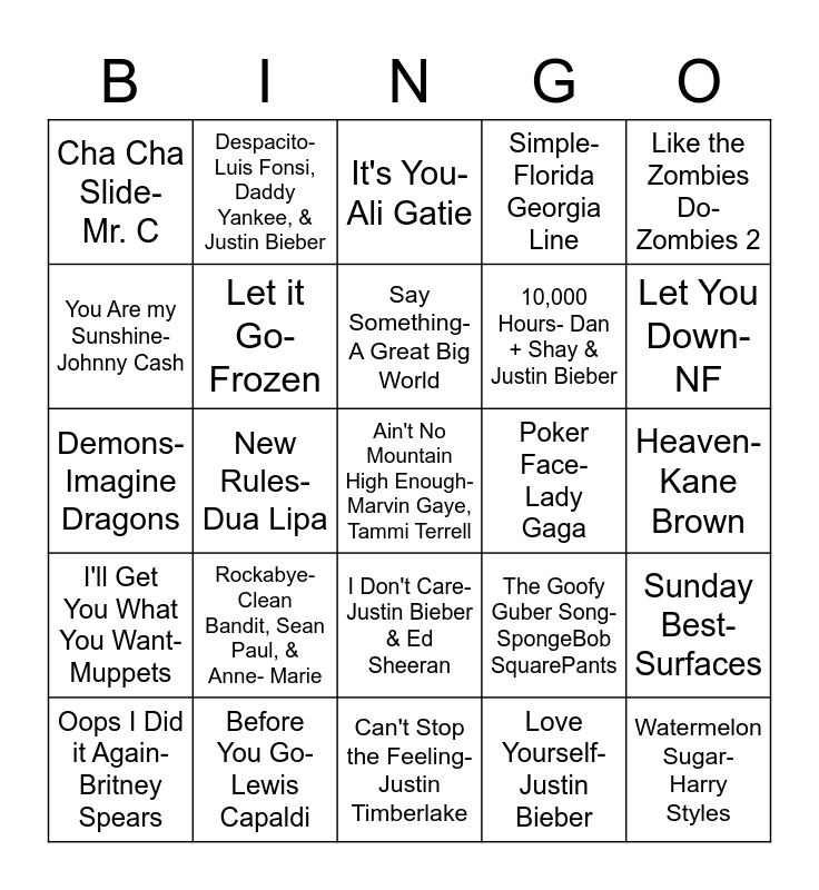 This bingo card has a free space and 24 words: Oops I Did it Again- Britney Spears, Rockabye- Clean Bandit, Sean Paul, & Anne- Marie, Say Something- A Great Big World, Love Yourself- Justin Bieber, Like the Zombies Do- Zombies 2, Cha Cha Slide- Mr. C, Despacito- Luis Fonsi, Daddy Yankee, & Justin Bieber, It's You- Ali Gatie, Poker Face- Lady Gaga, Heaven- Kane Brown, Demons- Imagine Dragons, Let it Go- Frozen, The Goofy Guber Song- SpongeBob SquarePants, Sunday Best- Surfaces, You Are my Sunshine- Johnny Cash, Before You Go- Lewis Capaldi, Can't Stop the Feeling- Justin Timberlake, Simple- Florida Georgia Line, Let You Down- NF, I'll Get You What You Want- Muppets, New Rules- Dua Lipa, I Don't Care- Justin Bieber & Ed Sheeran, 10,000 Hours- Dan + Shay & Justin Bieber and Watermelon Sugar- Harry Styles.