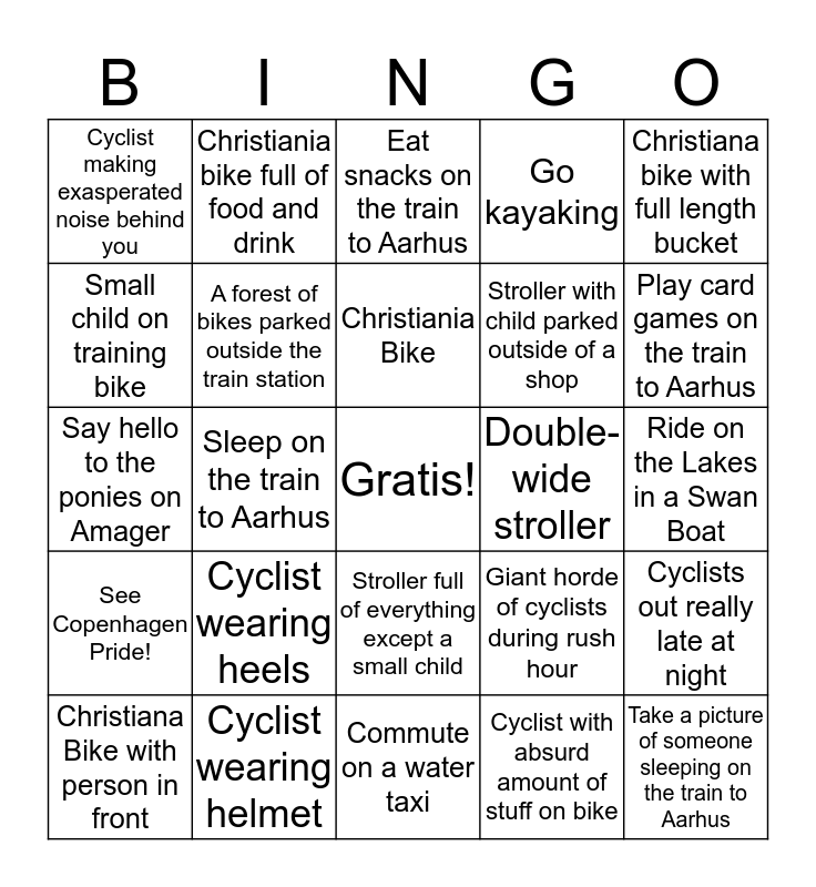 This bingo card has a free space and 24 words: Cyclist wearing heels, Cyclist wearing helmet, Christiania Bike, Christiana Bike with person in front, Christiana bike with full length bucket, Cyclist making exasperated noise behind you, Small child on training bike, Christiania bike full of food and drink, Double-wide stroller, Stroller full of everything except a small child, Stroller with child parked outside of a shop, Say hello to the ponies on Amager, Giant horde of cyclists during rush hour, Cyclists out really late at night, A forest of bikes parked outside the train station, Cyclist with absurd amount of stuff on bike, Ride on the Lakes in a Swan Boat, Eat snacks on the train to Aarhus, Play card games on the train to Aarhus, Sleep on the train to Aarhus, Take a picture of someone sleeping on the train to Aarhus, See Copenhagen Pride!, Go kayaking and Commute on a water taxi.