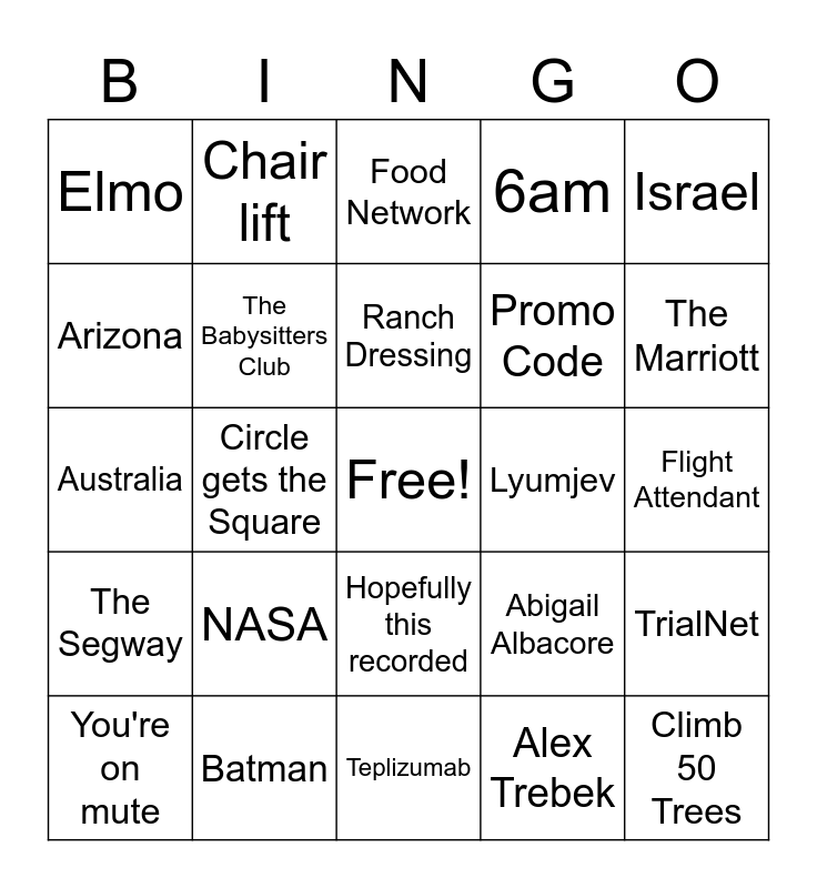 This bingo card has a free space and 29 words: You're on mute, Courgette, Circle gets the Square, My book, Elmo, Food Network, The Babysitters Club, NASA, Lyumjev, Batman, Flight Attendant, Climb 50 Trees, Teplizumab, Alex Trebek, The Marriott, Ultimate Tag, Hopefully this recorded, The Segway, Israel, Australia, Abigail Albacore, Extra long matches, Promo Code, Arizona, 6am, Chair lift, TrialNet, Ranch Dressing and Zoom.