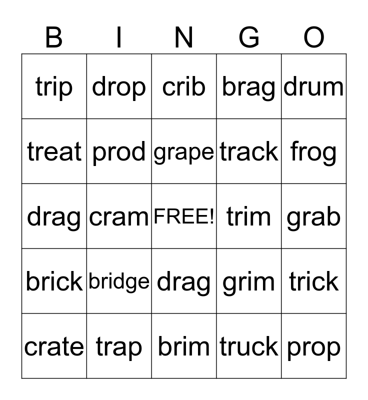 This bingo card has a free space and 24 words: bridge, trap, grape, crate, drum, trip, treat, drop, trim, drag, track, drag, grim, trick, prod, truck, grab, crib, frog, cram, prop, brick, brag and brim.