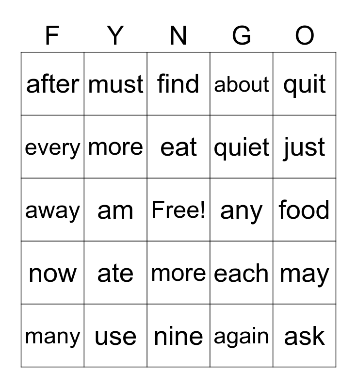 This bingo card has a free space and 24 words: ate, use, eat, many, quit, after, every, must, any, more, quiet, away, each, may, more, again, food, find, just, am, ask, now, about and nine.