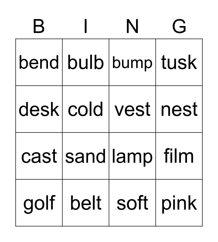 This bingo card has 16 words: belt, film, bump, bend, cast, bulb, lamp, soft, desk, cold, golf, tusk, sand, nest, vest and pink.