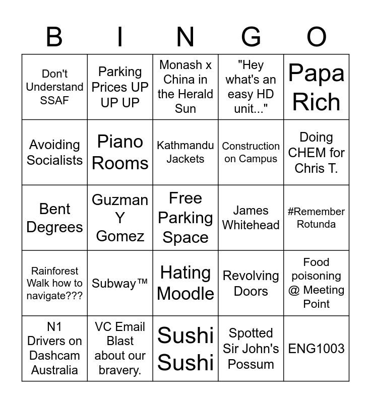 This bingo card has a free space and 24 words: Subway™, VC Email Blast about our bravery., Kathmandu Jackets, N1 Drivers on Dashcam Australia, Papa Rich, Don't Understand SSAF, Avoiding Socialists, Parking Prices UP UP UP, James Whitehead, Hating Moodle, Construction on Campus, Bent Degrees, Revolving Doors, Food poisoning @ Meeting Point, Piano Rooms, Spotted Sir John's Possum, #Remember Rotunda, Monash x China in the Herald Sun, Doing CHEM for Chris T., Guzman Y Gomez, ENG1003, Rainforest Walk how to navigate???, "Hey what's an easy HD unit..." and Sushi Sushi.
