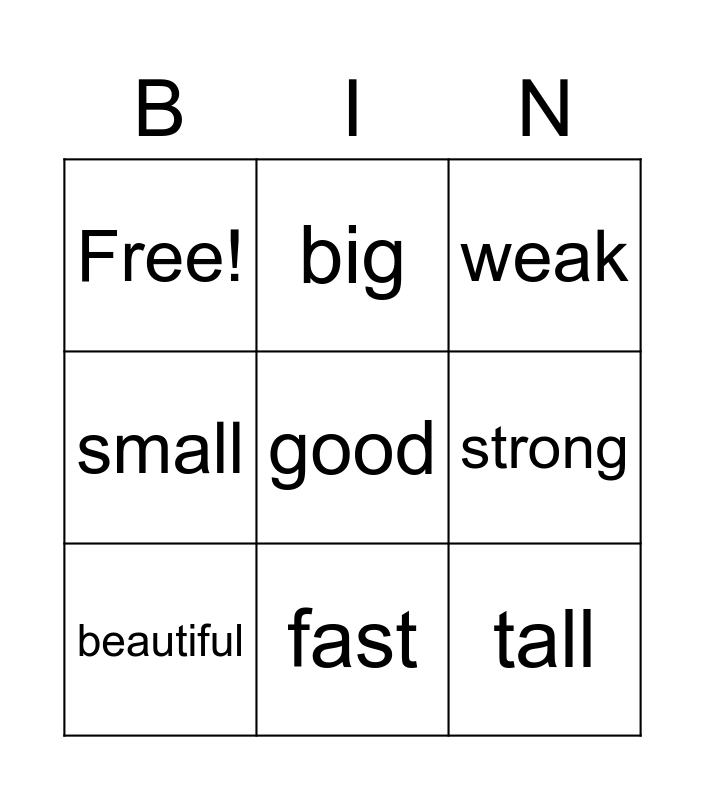 This bingo card has 9 words: beautiful, weak, big, small, Free!, strong, good, tall and fast.