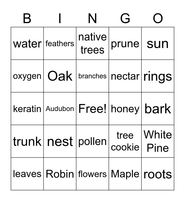 This bingo card has a free space and 24 words: nest, Robin, branches, leaves, sun, water, oxygen, feathers, honey, pollen, nectar, keratin, tree cookie, White Pine, Oak, Maple, bark, native trees, rings, Audubon, roots, trunk, prune and flowers.