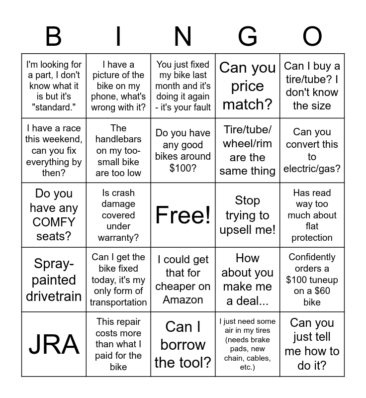 This bingo card has a free space and 24 words: Can I get the bike fixed today, it's my only form of transportation, This repair costs more than what I paid for the bike, Do you have any good bikes around $100?, JRA, Can I buy a tire/tube? I don't know the size, I'm looking for a part, I don't know what it is but it's "standard.", I have a race this weekend, can you fix everything by then?, I have a picture of the bike on my phone, what's wrong with it?, Stop trying to upsell me!, I could get that for cheaper on Amazon, Tire/tube/ wheel/rim are the same thing, Do you have any COMFY seats?, How about you make me a deal..., Confidently orders a $100 tuneup on a $60 bike, The handlebars on my too-small bike are too low, I just need some air in my tires (needs brake pads, new chain, cables, etc.), Has read way too much about flat protection, You just fixed my bike last month and it's doing it again - it's your fault, Can you convert this to electric/gas?, Is crash damage covered under warranty?, Can you just tell me how to do it?, Spray-painted drivetrain, Can you price match? and Can I borrow the tool?.