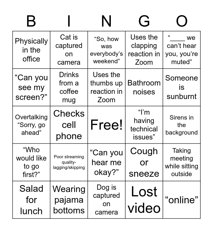 This bingo card has a free space and 73 words: TV noise in the background, “Sorry I was on mute”, Physically in the office, Keyboard typing sounds, Street noises in the background, Dog barking, “Who would like to go first?”, Children noises in the background, Cough or sneeze, “Let’s circle back to that”, “new normal”, “momentum”, Drinks from a coffee mug, Sirens in the background, Child is captured on camera, Cat is captured on camera, Dog is captured on camera, “Can you see my screen?”, “Have to jump on another call…”, “I’m having technical issues”, Uses the thumbs up reaction in Zoom, Uses the clapping reaction in Zoom, “____ we can’t hear you, you’re muted”, Using workout bands or weights, Salad for lunch, Using a Zoom background, Has a plant in the background, Taking meeting from a couch/recliner, “All hands-on deck”, “Any questions?”, Wearing pajama bottoms, Comment about the weather, Asks about 4th of July, “If you aren’t talking please mute yourself”, Checks cell phone, Answers an email, “I need to pop out for a minute…”, Leftovers for lunch, “online”, “HLC”, Lost video, Poor streaming quality-lagging/skipping, “I’ll give you your time back”, Someone walking while talking, Chewing noises, Bathroom noises, “So, how was everybody’s weekend”, “That’s…interesting”, “Next slide please”, Overtalking “Sorry, go ahead”, “Take that offline”, Laughter, Taking meeting from the kitchen table, “Is _____ on the call?”, “Can you email that to everyone?”, Stretch break, Lawn mower sounds in the background, “Can you hear me okay?”, Powerpoint malfunction, “Can you repeat that?”, Uses professional photo instead of live webcam, Bookcase in the background, Refers to something as “fun” (likely Jenni or Nichole_, Someone is sunburnt, Someone yawns, “Stay safe”, “Enrollment is down”, Someone introduces their child, spouse or pet, Taking meeting while sitting outside, Comments about their allergies, Comments about their garden, Comments about quarantine hobby and Talks to someone off screen.