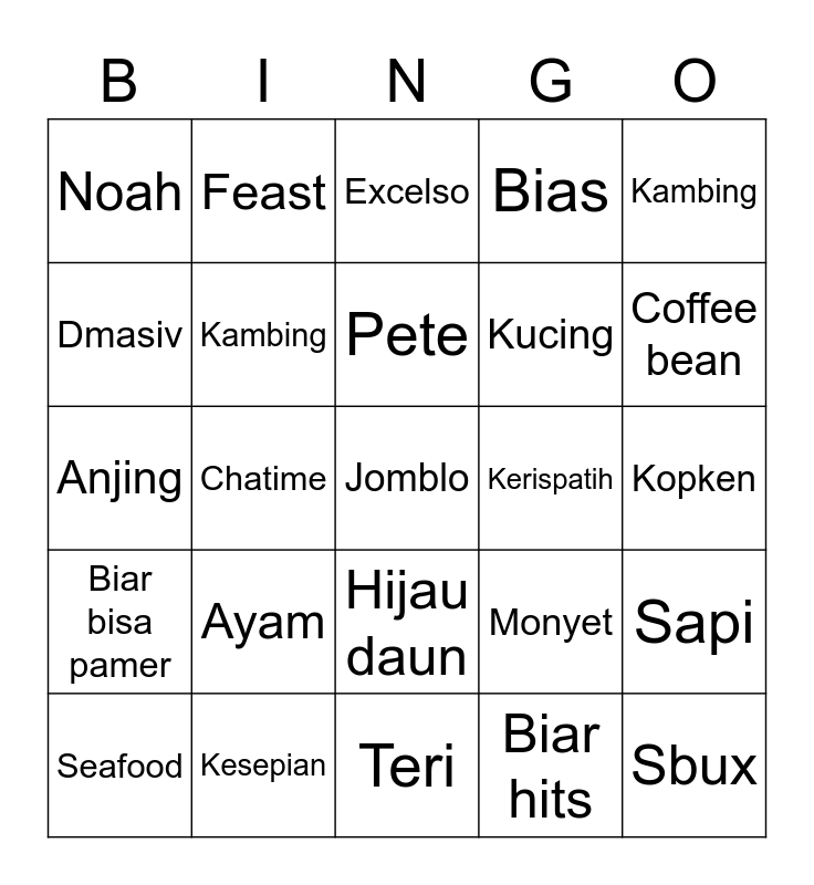 This bingo card has 25 words: Ayam, Teri, Pete, Seafood, Kambing, Noah, Dmasiv, Feast, Kerispatih, Hijau daun, Kucing, Anjing, Monyet, Sapi, Kambing, Sbux, Kopken, Excelso, Coffee bean, Chatime, Jomblo, Kesepian, Biar bisa pamer, Bias and Biar hits.