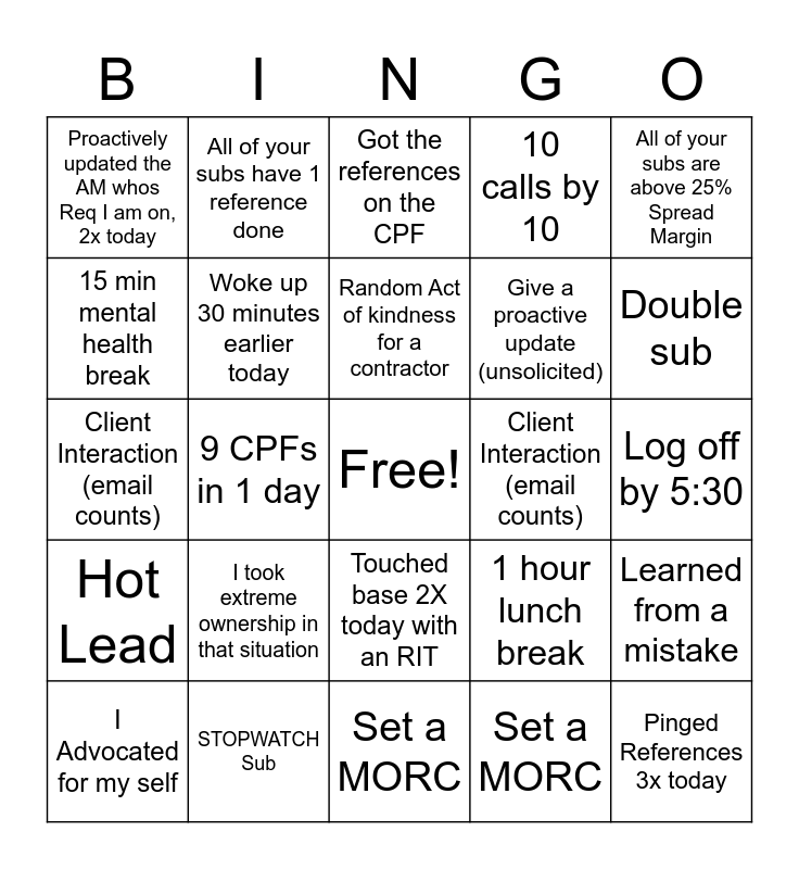 This bingo card has a free space and 24 words: I took extreme ownership in that situation, STOPWATCH Sub, Random Act of kindness for a contractor, I Advocated for my self, All of your subs are above 25% Spread Margin, Proactively updated the AM whos Req I am on, 2x today, 15 min mental health break, All of your subs have 1 reference done, Client Interaction (email counts), Touched base 2X today with an RIT, Give a proactive update (unsolicited), Client Interaction (email counts), 1 hour lunch break, Learned from a mistake, Woke up 30 minutes earlier today, Set a MORC, Log off by 5:30, Got the references on the CPF, Double sub, 9 CPFs in 1 day, Pinged References 3x today, Hot Lead, 10 calls by 10 and Set a MORC.