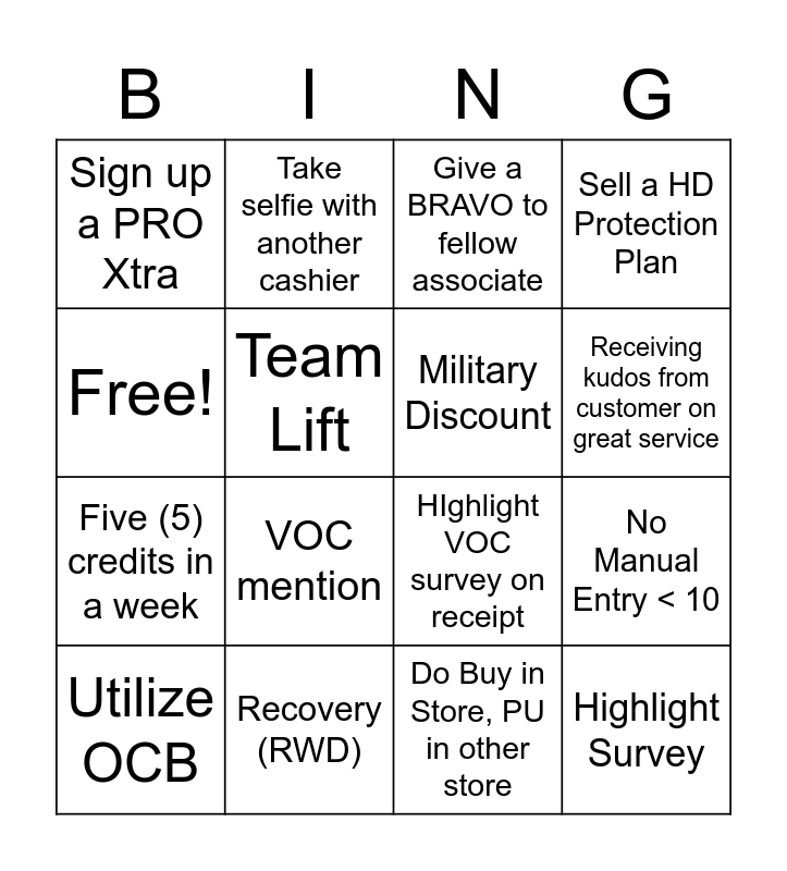 This bingo card has 16 words: Recovery (RWD), No Manual Entry < 10, Give a BRAVO to fellow associate, Sign up a PRO Xtra, Five (5) credits in a week, Take selfie with another cashier, HIghlight VOC survey on receipt, Do Buy in Store, PU in other store, Free!, Team Lift, Utilize OCB, Sell a HD Protection Plan, VOC mention, Receiving kudos from customer on great service, Military Discount and Highlight Survey.