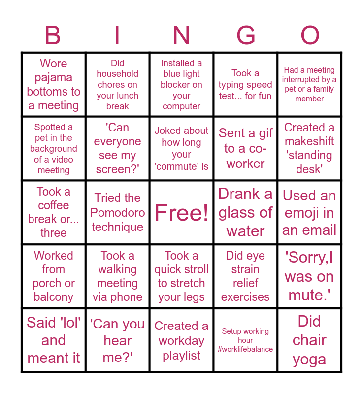 This bingo card has a free space and 24 words: Took a walking meeting via phone, 'Can you hear me?', Joked about how long your 'commute' is, Said 'lol' and meant it, Had a meeting interrupted by a pet or a family member, Wore pajama bottoms to a meeting, Spotted a pet in the background of a video meeting, Did household chores on your lunch break, Drank a glass of water, Took a quick stroll to stretch your legs, Sent a gif to a co-worker, Took a coffee break or... three, Did eye strain relief exercises, 'Sorry,I was on mute.', 'Can everyone see my screen?', Setup working hour #worklifebalance, Used an emoji in an email, Installed a blue light blocker on your computer, Created a makeshift 'standing desk', Tried the Pomodoro technique, Did chair yoga, Worked from porch or balcony, Took a typing speed test... for fun and Created a workday playlist.