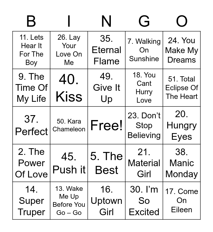 This bingo card has a free space and 54 words: 1. 9 to 5, 2. The Power Of Love, 3. If I Could Turn Back Time, 4. Summer of 69, 5. The Best, 6. I Wanna Dance With Somebody, 7. Walking On Sunshine, 8. Billie Jean, 9. The Time Of My Life, 10. I’m Coming Out, 11. Lets Hear It For The Boy, 12. Heaven Is A Place On Earth, 13. Wake Me Up Before You Go – Go, 14. Super Truper, 15. Girls Just Want To Have Fun, 16. Uptown Girl, 17. Come On Eileen, 18. You Cant Hurry Love, 19. I’m Still Standing, 20. Hungry Eyes, 21. Material Girl, 22. Endless love, 23. Don’t Stop Believing, 24. You Make My Dreams, 25. Club Tropicana, 26. Lay Your Love On Me, 27. Loco In Acapulco, 28. Faith, 29. Love Shack, 30. I’m So Excited, 31. The Way You Make Me Feel, 32. I’m Gonna Be (500 miles), 33. The Winner Takes It All, 34. Ain’t Nobody, 35. Eternal Flame, 36. Holding Out For A Hero, 37. Perfect, 38. Manic Monday, 39. Power of love, 40. Kiss, 41. Tell It To My Heart, 42. Like A Virgin, 43. Holiday, 44. You Can Call Me Al, 45. Push it, 46. We Built This City, 47. Never To Much, 48. Everywhere, 49. Give It Up, 50. Kara Chameleon, 51. Total Eclipse Of The Heart, 52. Higher Love, 53. Eternal Flame and 54. Take On Me.