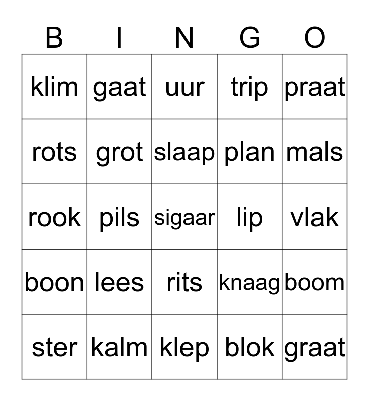 This bingo card has a free space and 24 words: lees, kalm, slaap, ster, praat, klim, rots, gaat, lip, rits, plan, rook, knaag, boom, grot, blok, vlak, uur, mals, pils, graat, boon, trip and klep.