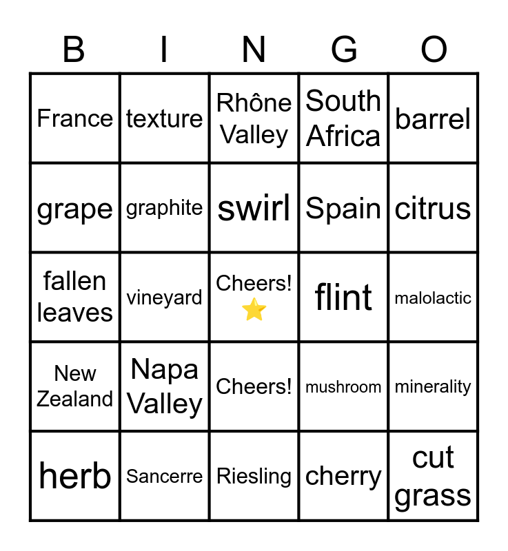This bingo card has a free space and 67 words: Abaluche! 🥂, tannin, acidity, minerality, mouthfeel, finish, texture, malolactic, swirl, nose, Cheers!, Abaluche!, malolactic, barrel, tank, grape, vineyard, France, Italy, Spain, Napa Valley, New Zealand, South Africa, cherry, strawberry, blueberry, Apple, pear, citrus, brioche, cut grass, melon, wet rock, cured meat, pepper, herb, fresh earth, mushroom, fallen leaves, slate, Kimmeridgean, graphite, flint, jasmine, apricot, white flower, Provence, Sancerre, Champagne, Rioja, Rhône Valley, Sonoma, Washington, Oregon, Finger Lakes, Riesling, Sauvignon Blanc, Pinot Noir, Chardonnay, Pinot Meunier, Gamay, Grenache, Syrah, Mourvèdre, Tempranillo, Chianti and Barolo.