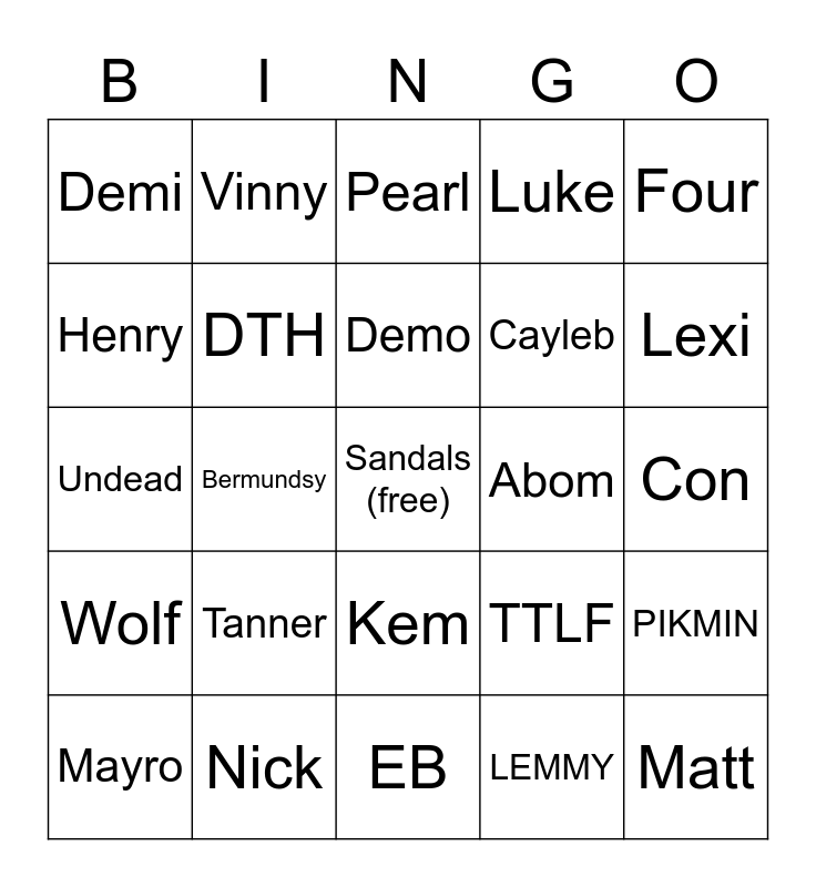 This bingo card has a free space and 24 words: Tanner, Nick, Demo, Mayro, Four, Demi, Henry, Vinny, Abom, Kem, Cayleb, Undead, TTLF, PIKMIN, DTH, LEMMY, Con, Pearl, Lexi, Bermundsy, Matt, Wolf, Luke and EB.
