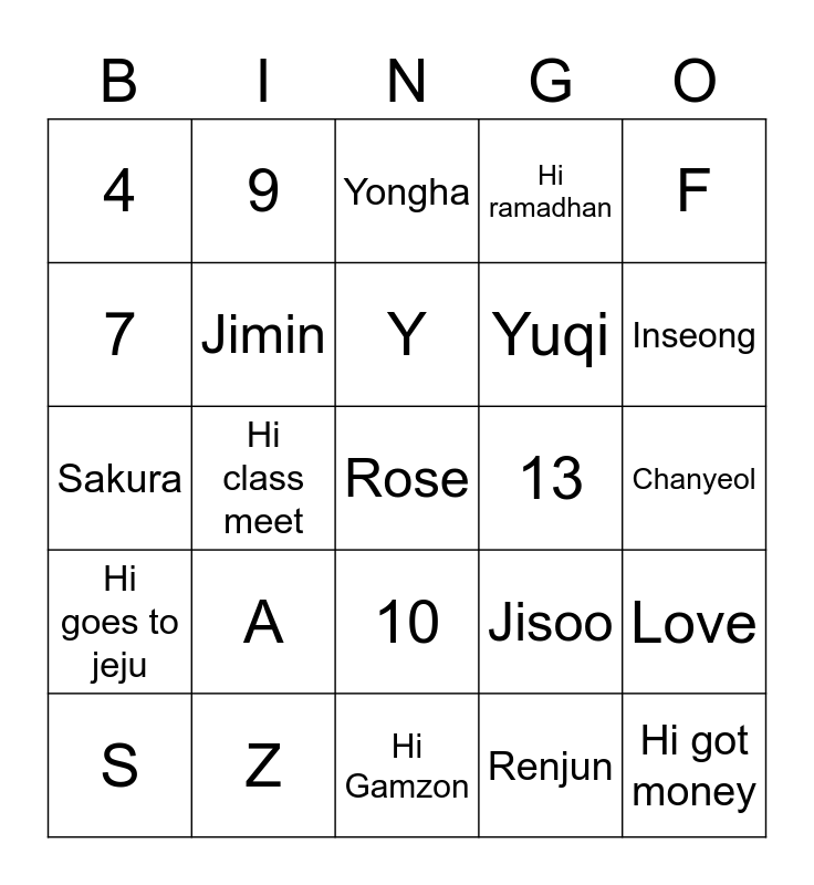 This bingo card has a free space and 24 words: A, Z, Y, S, F, 4, 7, 9, 13, 10, Yuqi, Sakura, Jisoo, Love, Jimin, Renjun, Chanyeol, Yongha, Inseong, Hi class meet, Hi got money, Hi goes to jeju, Hi ramadhan and Hi Gamzon.