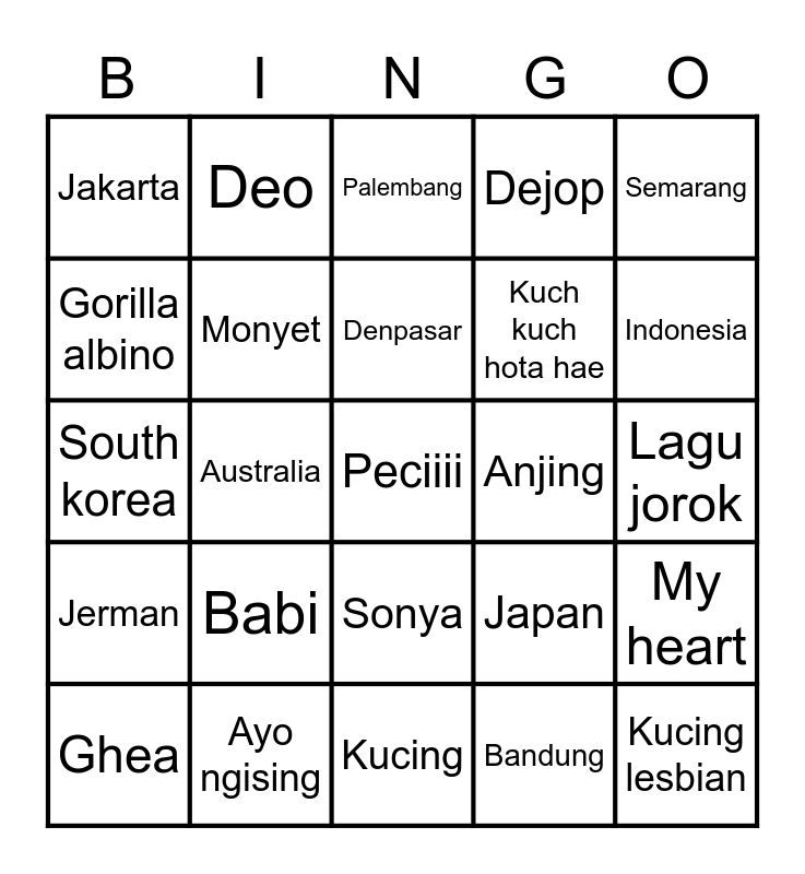 This bingo card has a free space and 24 words: Babi, Ayo ngising, Denpasar, Ghea, Semarang, Jakarta, Gorilla albino, Deo, Anjing, Sonya, Kuch kuch hota hae, South korea, Japan, My heart, Monyet, Bandung, Lagu jorok, Palembang, Indonesia, Australia, Kucing lesbian, Jerman, Dejop and Kucing.