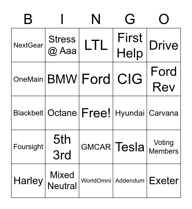 This bingo card has a free space and 39 words: Toyota, Honda, Nissan, BMW, Harley, GMCAR, Ford, SDART, Drive, Foursight, Octane, First Help, Exeter, Carvana, Hyundai, 5th 3rd, Ally, NextGear, Americredit, Tesla, OneMain, WorldOmni, CIG, Ford Rev, Veros, US Auto Sales, USAA, ACC, EL, Stress @ Aaa, Loan, Lease, LTL, Mixed Neutral, Addendum, Vote Tally, Voting Members, Blackbelt and Finding.