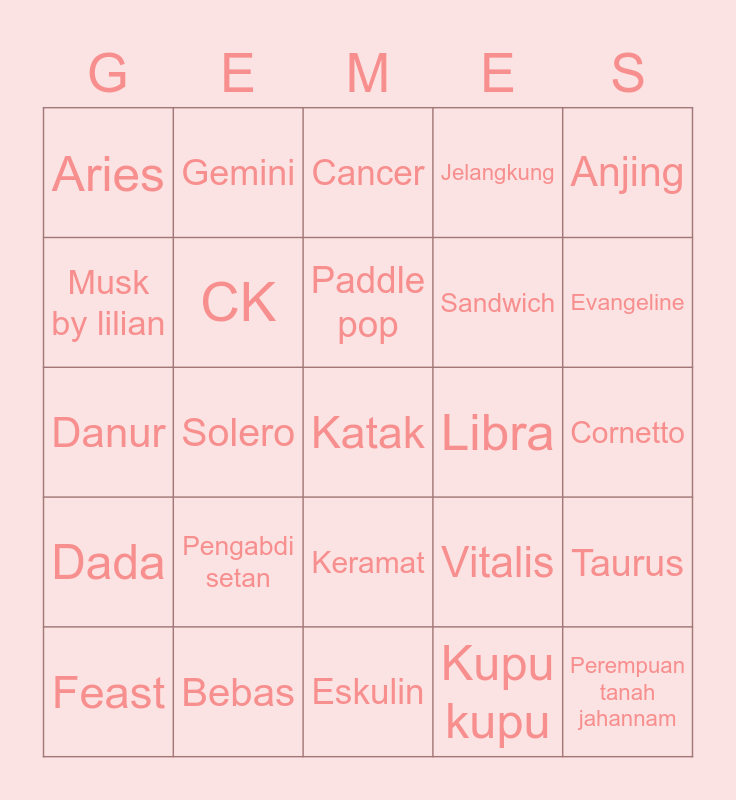 This bingo card has 25 words: Dada, Bebas, Katak, Kupu kupu, Anjing, Aries, Gemini, Cancer, Libra, Taurus, Musk by lilian, CK, Eskulin, Vitalis, Evangeline, Feast, Solero, Paddle pop, Sandwich, Cornetto, Danur, Pengabdi setan, Keramat, Jelangkung and Perempuan tanah jahannam.