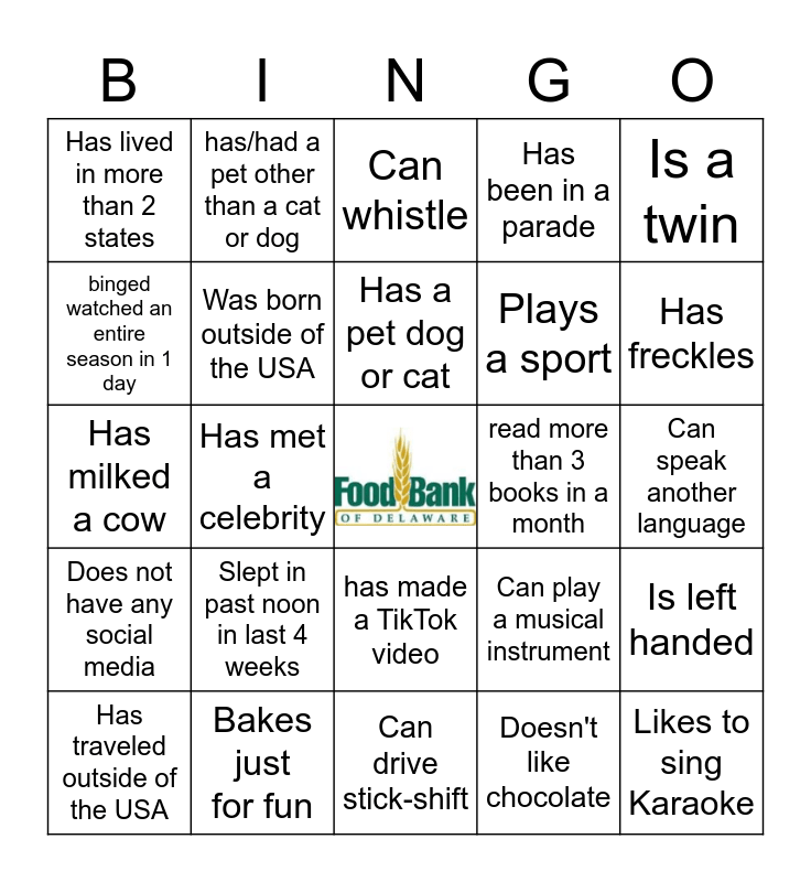 This bingo card has a free space and 24 words: Slept in past noon in last 4 weeks, Bakes just for fun, Has a pet dog or cat, Has traveled outside of the USA, Is a twin, Has lived in more than 2 states, binged watched an entire season in 1 day, has/had a pet other than a cat or dog, read more than 3 books in a month, has made a TikTok video, Plays a sport, Has milked a cow, Can play a musical instrument, Is left handed, Was born outside of the USA, Doesn't like chocolate, Can speak another language, Can whistle, Has freckles, Has met a celebrity, Likes to sing Karaoke, Does not have any social media, Has been in a parade and Can drive stick-shift.