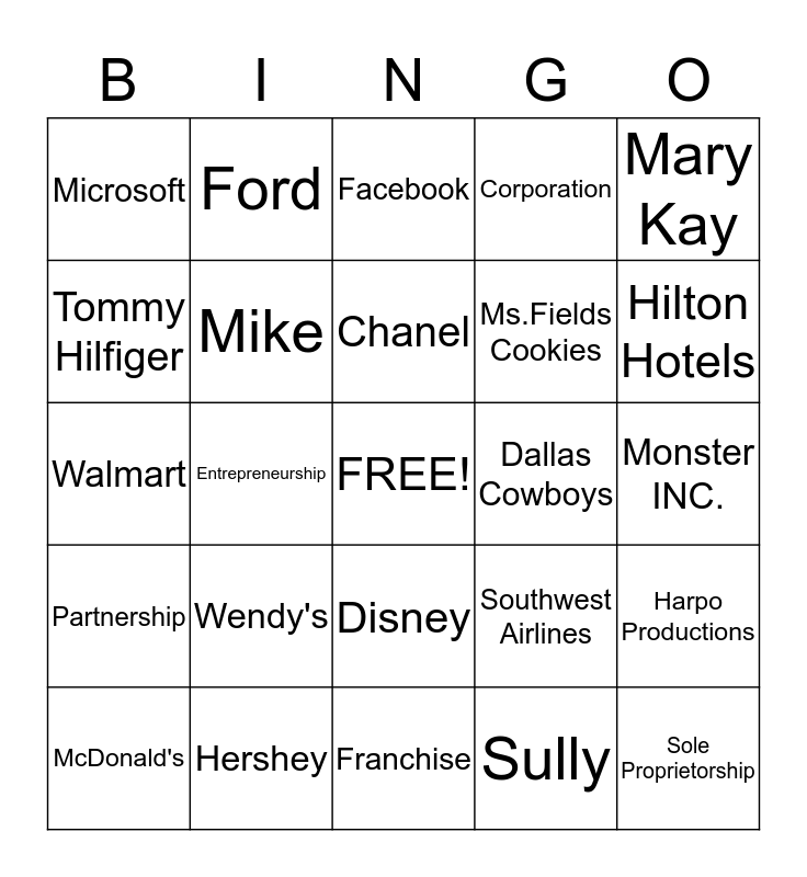 This bingo card has a free space and 24 words: Wendy's, Hershey, Chanel, McDonald's, Mary Kay, Microsoft, Tommy Hilfiger, Ford, Dallas Cowboys, Disney, Ms.Fields Cookies, Walmart, Southwest Airlines, Harpo Productions, Mike, Sully, Monster INC., Facebook, Hilton Hotels, Entrepreneurship, Sole Proprietorship, Partnership, Corporation and Franchise.
