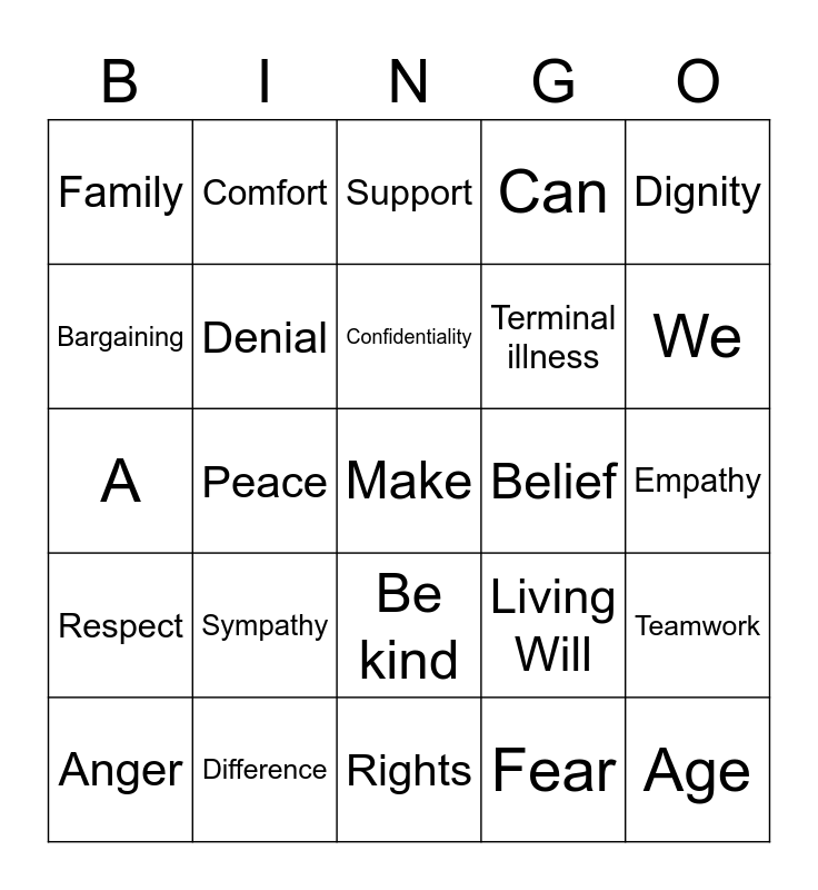This bingo card has a free space and 24 words: Sympathy, Difference, Confidentiality, Anger, Dignity, Family, Bargaining, Comfort, Belief, Be kind, Terminal illness, A, Living Will, Teamwork, Denial, Fear, Empathy, Support, We, Peace, Age, Respect, Can and Rights.