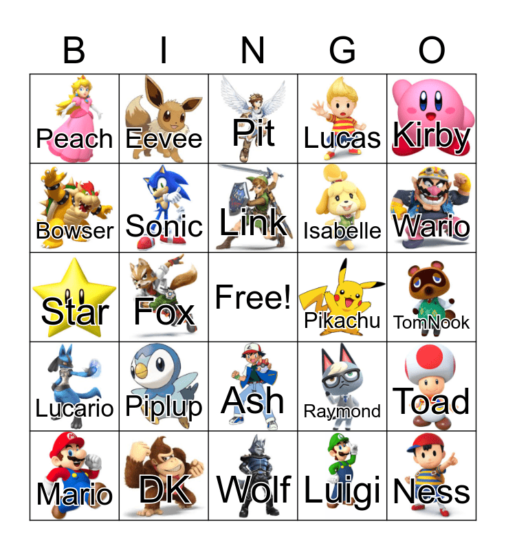 This bingo card has 24 images, a free space and 24 words: Piplup, DK, Link, Mario, Kirby, Peach, Bowser, Eevee, Pikachu, Ash, Isabelle, Star, Raymond, Toad, Sonic, Luigi, TomNook, Pit, Wario, Fox, Ness, Lucario, Lucas and Wolf.