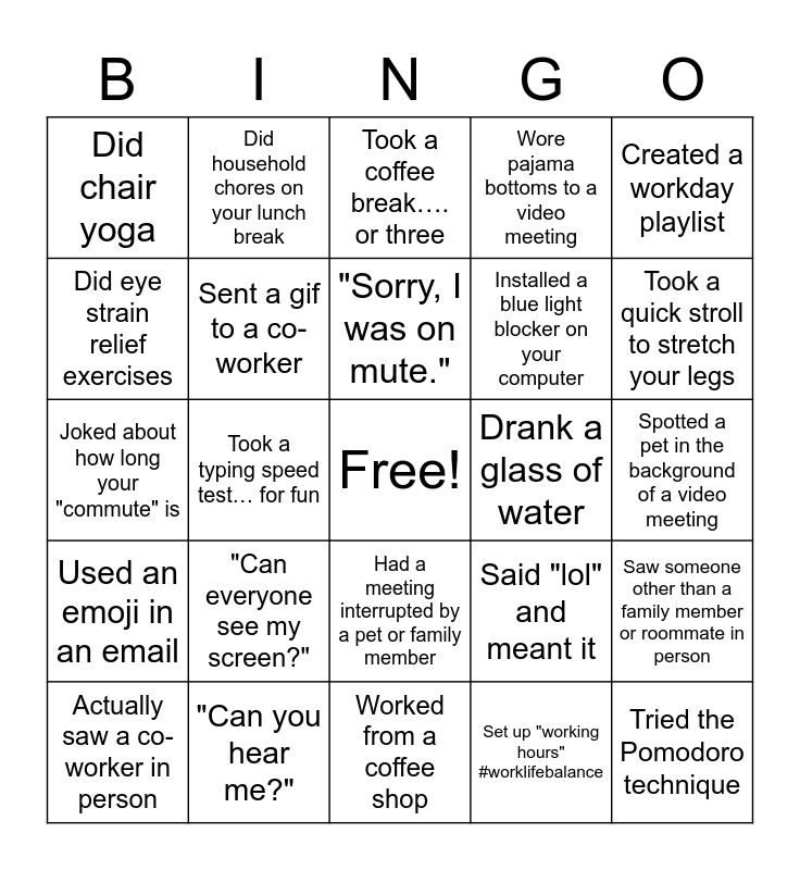This bingo card has a free space and 24 words: "Can everyone see my screen?", "Can you hear me?", "Sorry, I was on mute.", Actually saw a co-worker in person, Created a workday playlist, Did chair yoga, Did eye strain relief exercises, Did household chores on your lunch break, Drank a glass of water, Had a meeting interrupted by a pet or family member, Installed a blue light blocker on your computer, Joked about how long your "commute" is, Said "lol" and meant it, Saw someone other than a family member or roommate in person, Sent a gif to a co-worker, Set up "working hours" #worklifebalance, Spotted a pet in the background of a video meeting, Took a coffee break…. or three, Took a quick stroll to stretch your legs, Took a typing speed test… for fun, Tried the Pomodoro technique, Used an emoji in an email, Wore pajama bottoms to a video meeting and Worked from a coffee shop.