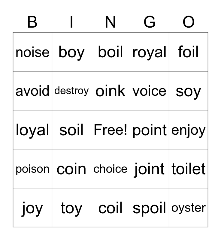 This bingo card has a free space and 24 words: coin, toy, oink, joy, foil, noise, avoid, boy, point, choice, voice, loyal, joint, toilet, destroy, spoil, enjoy, boil, soy, soil, oyster, poison, royal and coil.