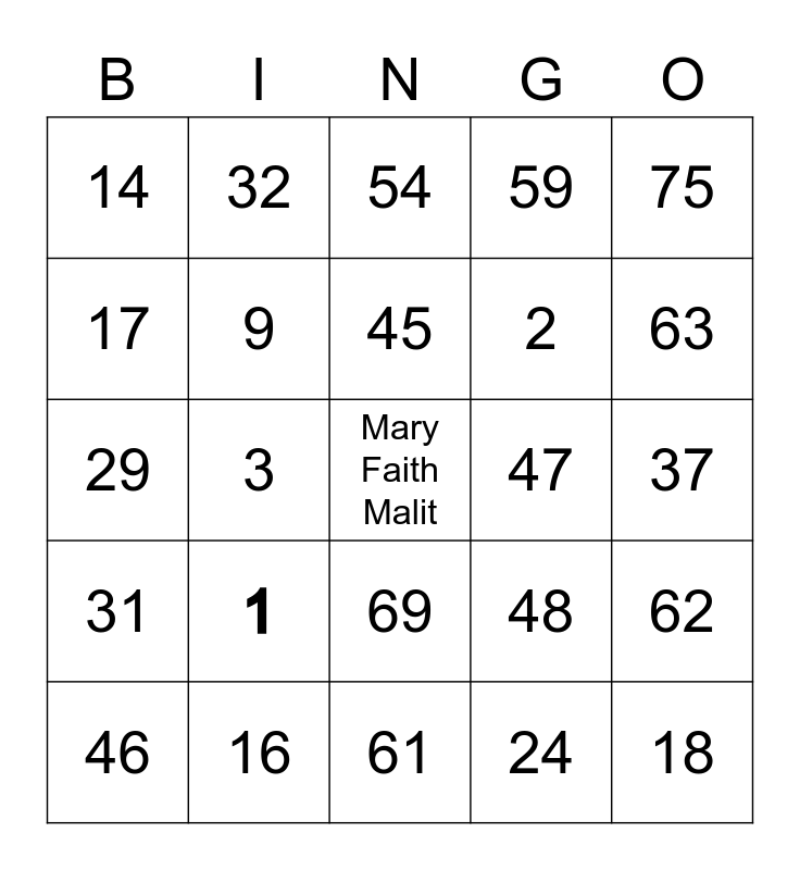 This bingo card has a free space and 24 words: 1, 16, 45, 46, 75, 14, 17, 32, 47, 69, 2, 29, 48, 62, 9, 24, 37, 54, 63, 3, 18, 31, 59 and 61.