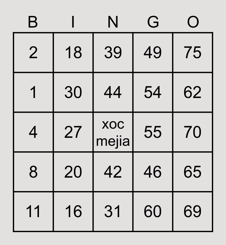 This bingo card has a free space and 24 words: 11, 20, 44, 60, 75, 2, 18, 39, 55, 70, 4, 30, 46, 65, 1, 16, 31, 49, 62, 8, 27, 42, 54 and 69.