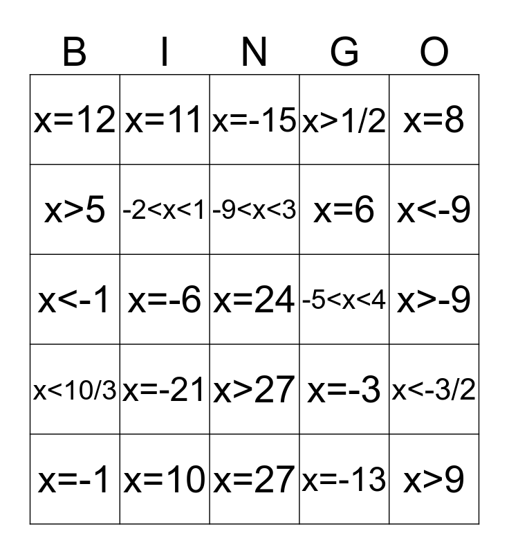 This bingo card has 51 words: No Solution, x=24, x=-12, x=27, x=-21, -4<x<4, x=11, x=-7, x>5, x<1, -2<x<1, x>1/2, x<-3/2, x=-3, x=18, x=-18, -9<x<3, -5<x<4, 2<x<10, x=8, x=-6, x=-13, x=12, x=6, x=-5, x>9, x<-9, -6<x<14, x=-1, x=-15, -8<x<8, x>10/3, x<-2, x=1, x=-5/3, x=10, x=-10, x=7, x=-1/3, x<9, x>-9, x<10/3, x>-2, x>-5, x<5, x>1, x<-1, x=13, x=-24, x>27 and x=21.