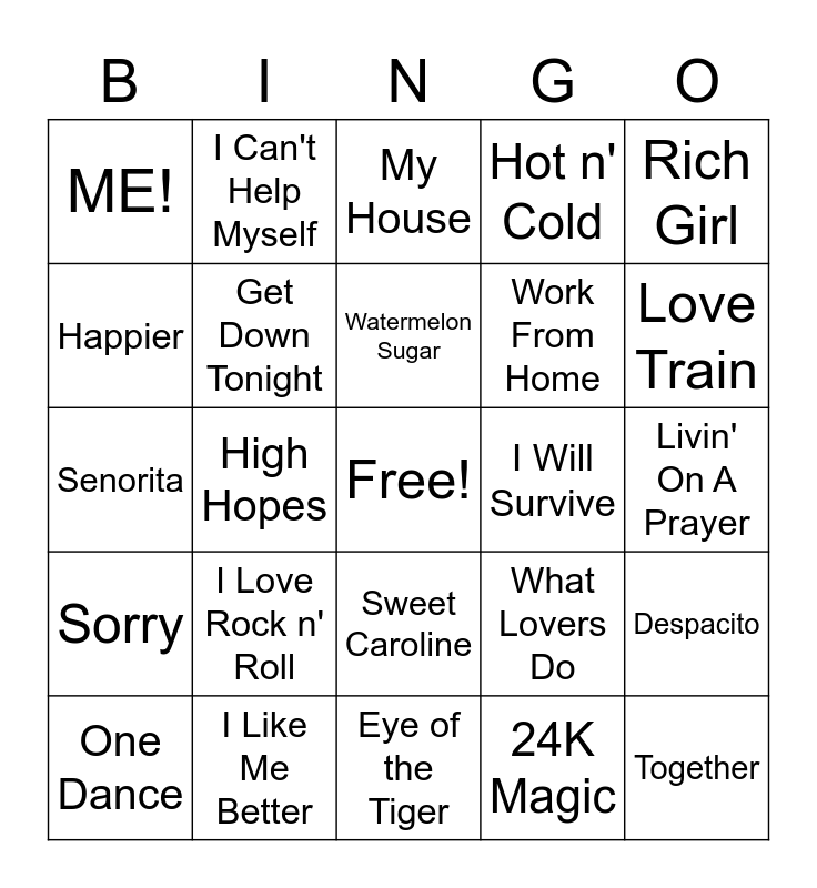 This bingo card has a free space and 66 words: Party in the USA, ABC, Old Town Road, Despacito, What Do You Mean?, Fancy, I Can't Help Myself, My Girl, Watermelon Sugar, Mrs. Robinson, Sweet Caroline, More Than A Feeling, Livin' On A Prayer, Rich Girl, Poker Face, Happier, High Hopes, ME!, 867-5309/Jenny, Work From Home, I Love Rock n' Roll, Sorry, Hot n' Cold, All Summer Long, Royals, Wonderwall, Stacy's Mom, Rain On Me, Together, Thank u, next, One Dance, Wagon Wheel, Sunday Best, The Middle, What Lovers Do, I Like Me Better, Sucker, Senorita, 24K Magic, Uptown Funk, Get Down Tonight, Stayin' Alive, I Will Survive, Dancing Machine, YMCA, Dancing Queen, Love Train, Life is a Highway, I Want You Back, Don't Stop Believin', Holiday, Girls Just Want To Have Fun, Signed, Sealed, Delivered, I'm Coming Out, Ain't No Mountain High Enough, Celebration, Here I Go Again, Joy To The World, My House, Eye of the Tiger, Uptown Girl, Boogie Shoes, We Are Family, Single Ladies, Crazy In Love and Empire State of Mind.