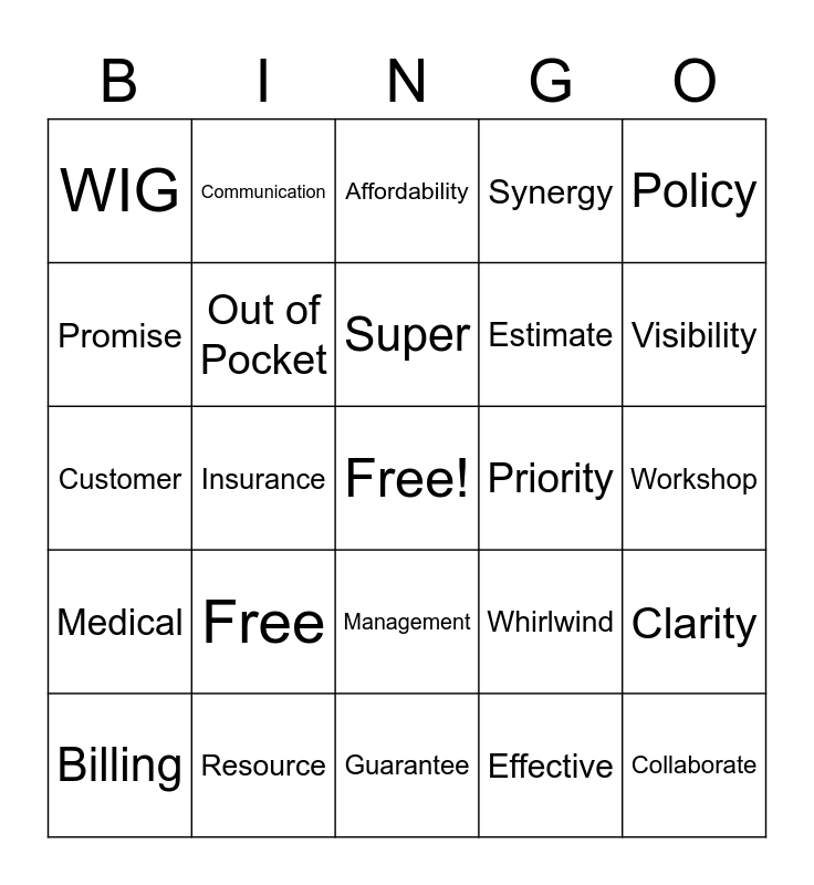 This bingo card has a free space and 39 words: Patient, Cost, Complete, Out of Pocket, Billing, Management, Super, Excited, Policy, Medical, Insurance, Synergy, Collaborate, Workshop, Priority, Free, Discipline, WIG, Important, Whirlwind, Promise, Guarantee, Estimate, Visibility, Salesforce, Issues, Open, Honesty, Transparency, Communication, Channel, Ops, Affordability, Resource, Effective, Handbook, Clarity, Customer and Bubba.