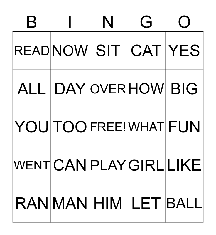 This bingo card has a free space and 24 words: CAN, MAN, OVER, RAN, YES, READ, ALL, NOW, WHAT, PLAY, HOW, YOU, GIRL, LIKE, DAY, LET, FUN, SIT, BIG, TOO, BALL, WENT, CAT and HIM.