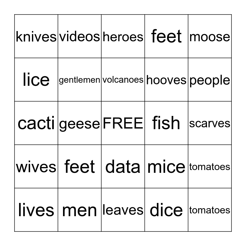 This bingo card has a free space and 24 words: feet, men, volcanoes, lives, moose, knives, lice, videos, fish, data, hooves, cacti, mice, tomatoes, gentlemen, dice, scarves, heroes, people, geese, tomatoes, wives, feet and leaves.