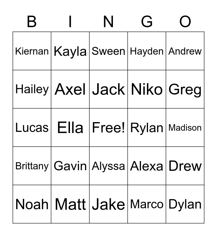 This bingo card has a free space and 64 words: Colton, Jeremiah, Jonathan, Drew, Kisa, Cody, Kayla, Alex, Jack, Brady, Alyssa, Justin, Madison, Andrew, Maren, Hailey, Ella, Kiernan, Jeremy, Niko, Gavin, Brittany, Hayden, Maddelynn, Avery, Adrian, Annalise, Ivy, Mia, Ethan, Kallie, Carter, Grace, Amayah, Greg, Noah, Owen, Marco, AJ, Axel, Lucas, Rylan, Wesley, Liam, Lindsay, Dylan, Matt, Conner, Alexa, Sydney, Simone, Brian, Jake, Zyann, Adrianne, Amanda, Sween, Niya, Nurse Trish, Superman, Playground, Gym, Blacktop and Swings.
