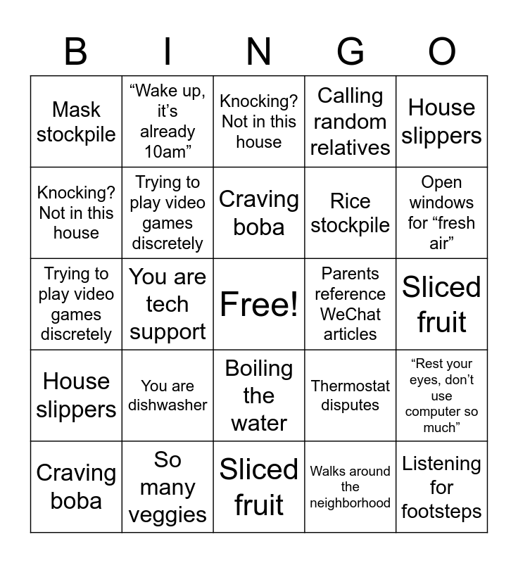 This bingo card has a free space and 48 words: So many veggies, Listening for footsteps, “Time to eat!”, Sliced fruit, You are dishwasher, You are garden labor, “Wake up, it’s already 10am”, “Go sleep, it’s already 11pm”, Knocking? Not in this house, “Drink more water”, Trying to play video games discretely, Calling random relatives, “Rest your eyes, don’t use computer so much”, Thermostat disputes, Replies in English, Open windows for “fresh air”, Craving boba, Parents reference WeChat articles, Boiling the water, House slippers, You are tech support, Walks around the neighborhood, Mask stockpile, Rice stockpile, Replies in English, Open windows for “fresh air”, Craving boba, Parents reference WeChat articles, Boiling the water, House slippers, You are tech support, Walks around the neighborhood, Mask stockpile, Rice stockpile, So many veggies, Listening for footsteps, “Time to eat!”, Sliced fruit, You are dishwasher, You are garden labor, “Wake up, it’s already 10am”, “Go sleep, it’s already 11pm”, Knocking? Not in this house, “Drink more water”, Trying to play video games discretely, Calling random relatives, “Rest your eyes, don’t use computer so much” and Thermostat disputes.