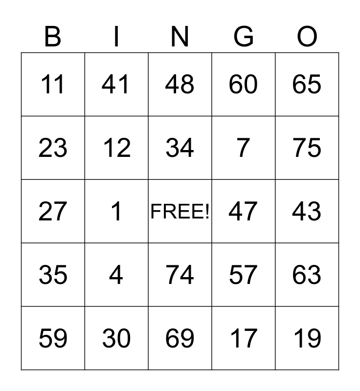 This bingo card has a free space and 24 words: 4, 30, 34, 59, 65, 11, 23, 41, 47, 74, 7, 27, 57, 63, 12, 17, 43, 48, 75, 1, 19, 35, 60 and 69.