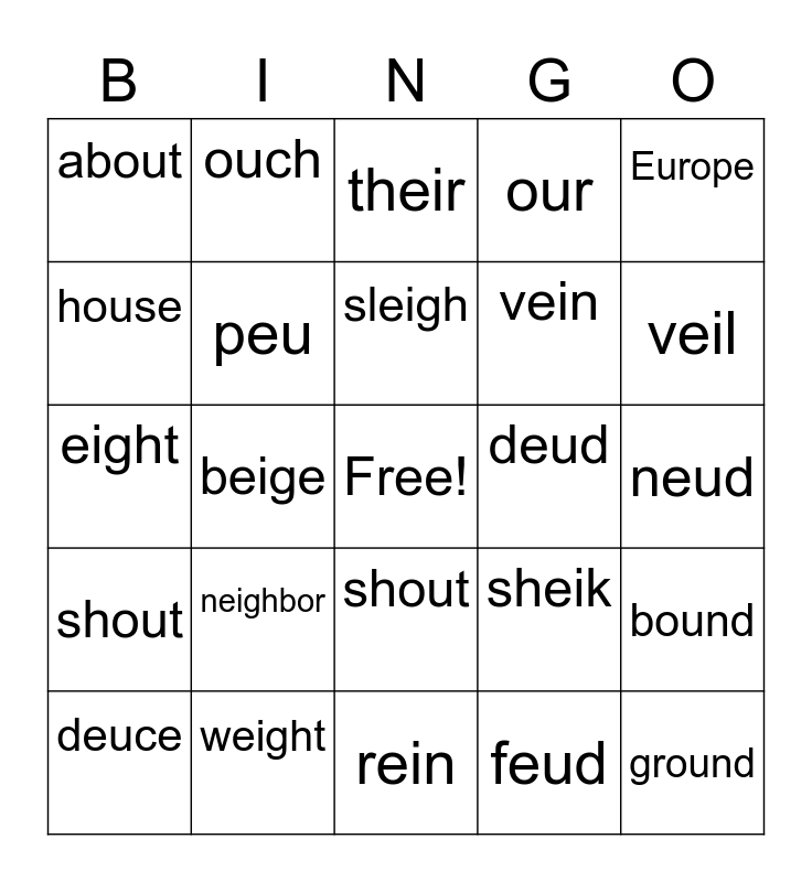 This bingo card has a free space and 24 words: neighbor, weight, sleigh, deuce, Europe, about, house, ouch, deud, shout, vein, eight, sheik, bound, peu, feud, neud, their, veil, beige, ground, shout, our and rein.
