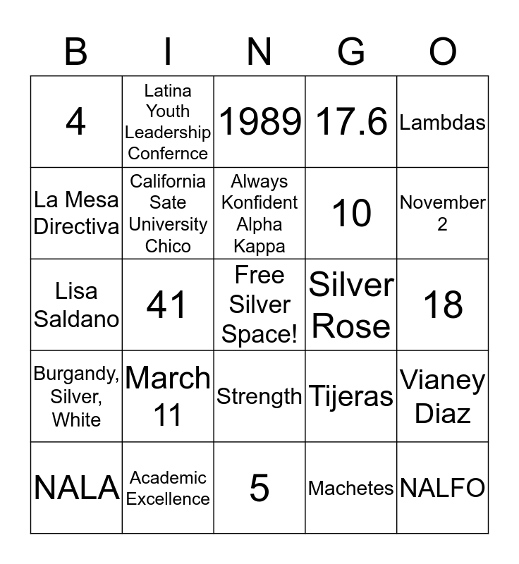 This bingo card has a free space and 24 words: March 11, Academic Excellence, Always Konfident Alpha Kappa, NALA, Lambdas, 4, La Mesa Directiva, Latina Youth Leadership Confernce, Silver Rose, Strength, 10, Lisa Saldano, Tijeras, Vianey Diaz, California Sate University Chico, Machetes, 18, 1989, November 2, 41, NALFO, Burgandy, Silver, White, 17.6 and 5.