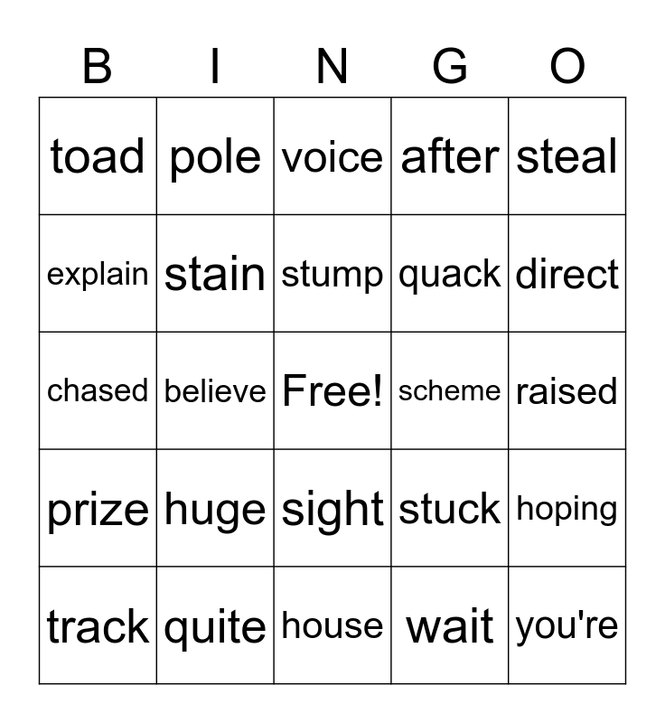 This bingo card has a free space and 24 words: huge, quite, stump, track, steal, toad, explain, pole, scheme, sight, quack, chased, stuck, hoping, stain, wait, raised, voice, direct, believe, you're, prize, after and house.