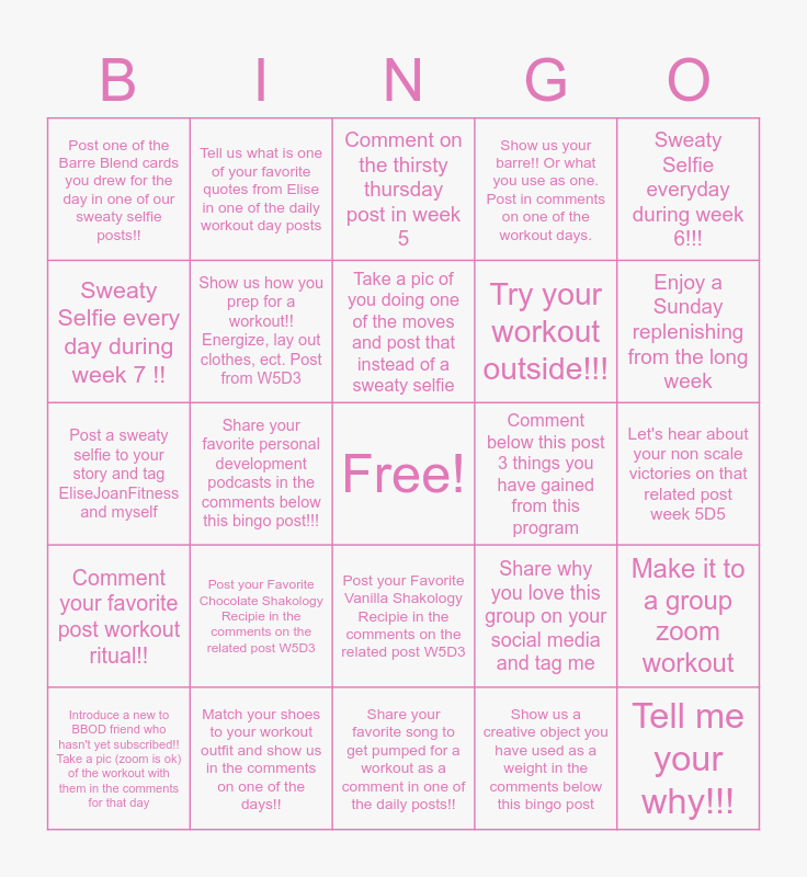 This bingo card has a free space and 24 words: Introduce a new to BBOD friend who hasn't yet subscribed!! Take a pic (zoom is ok) of the workout with them in the comments for that day, Post your Favorite Chocolate Shakology Recipie in the comments on the related post W5D3, Take a pic of you doing one of the moves and post that instead of a sweaty selfie, Show us a creative object you have used as a weight in the comments below this bingo post, Sweaty Selfie everyday during week 6!!!, Post one of the Barre Blend cards you drew for the day in one of our sweaty selfie posts!!, Tell us what is one of your favorite quotes from Elise in one of the daily workout day posts, Comment on the thirsty thursday post in week 5, Comment below this post 3 things you have gained from this program, Let's hear about your non scale victories on that related post week 5D5, Post a sweaty selfie to your story and tag EliseJoanFitness and myself, Show us how you prep for a workout!! Energize, lay out clothes, ect. Post from W5D3, Share why you love this group on your social media and tag me, Make it to a group zoom workout, Sweaty Selfie every day during week 7 !!, Match your shoes to your workout outfit and show us in the comments on one of the days!!, Share your favorite song to get pumped for a workout as a comment in one of the daily posts!!, Show us your barre!! Or what you use as one. Post in comments on one of the workout days., Enjoy a Sunday replenishing from the long week, Comment your favorite post workout ritual!!, Share your favorite personal development podcasts in the comments below this bingo post!!!, Post your Favorite Vanilla Shakology Recipie in the comments on the related post W5D3, Try your workout outside!!! and Tell me your why!!!.