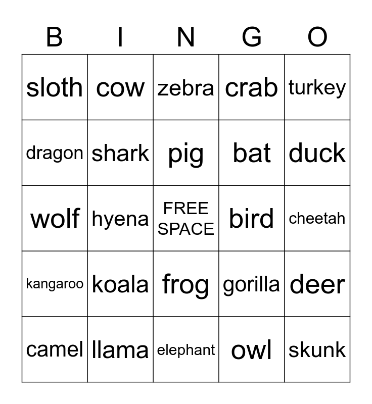 This bingo card has a free space and 24 words: koala, llama, pig, camel, turkey, sloth, dragon, cow, bird, frog, bat, wolf, gorilla, deer, shark, owl, cheetah, zebra, duck, hyena, skunk, kangaroo, crab and elephant.