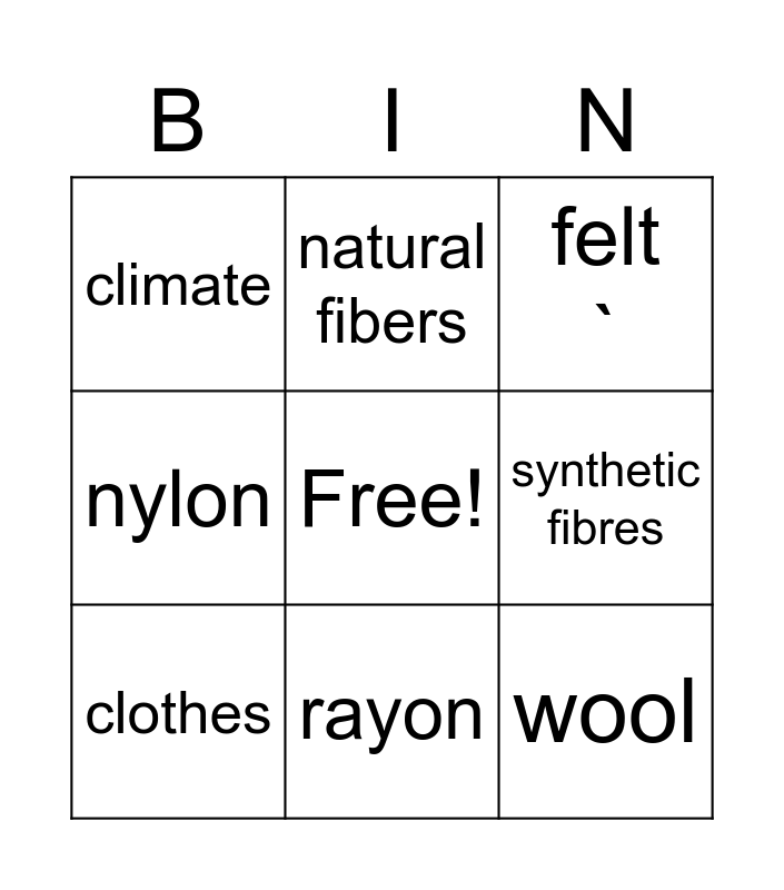 This bingo card has a free space and 8 words: synthetic fibres, felt `, natural fibers, clothes, climate, wool, nylon and rayon.