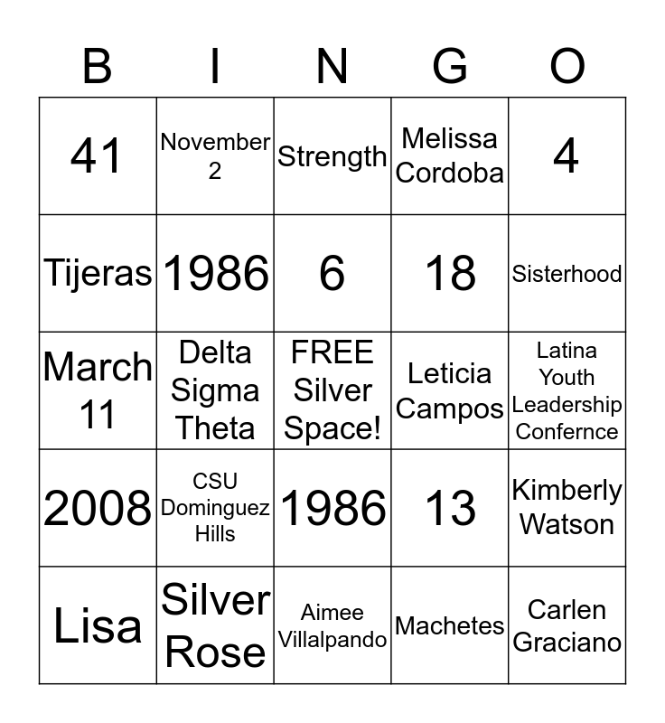This bingo card has a free space and 24 words: CSU Dominguez Hills, Silver Rose, 6, Lisa, 4, 41, Tijeras, November 2, Leticia Campos, 1986, 18, March 11, 13, Kimberly Watson, 1986, Machetes, Latina Youth Leadership Confernce, Strength, Sisterhood, Delta Sigma Theta, Carlen Graciano, 2008, Melissa Cordoba and Aimee Villalpando.