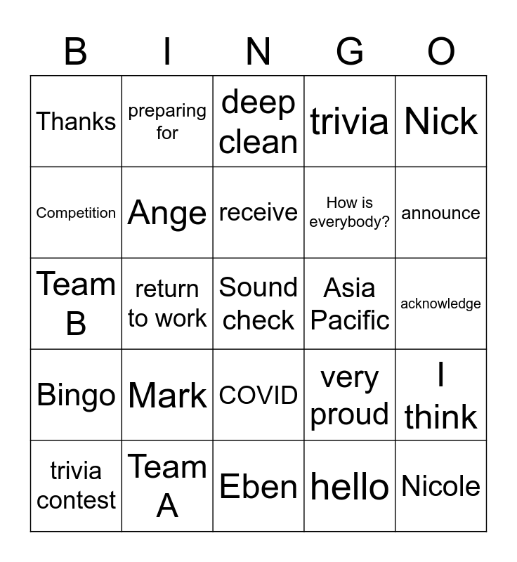 This bingo card has a free space and 39 words: Melbourne, Victoria, Marty, Ange, trivia contest, COVID, receive, Sydney, Nick, Bingo, return to work, trivia, Nicole, acknowledge, Asia Pacific, Mark, 5 in a row, Thanks, Ian, very proud, Competition, Eben, How is everybody?, announce, tough times, isn't getting better, Stage 3, safety of staff, 50%, preparing for, Stage 4, I found, deep clean, Team A, hello, updates from, I think, Team B and chosen.