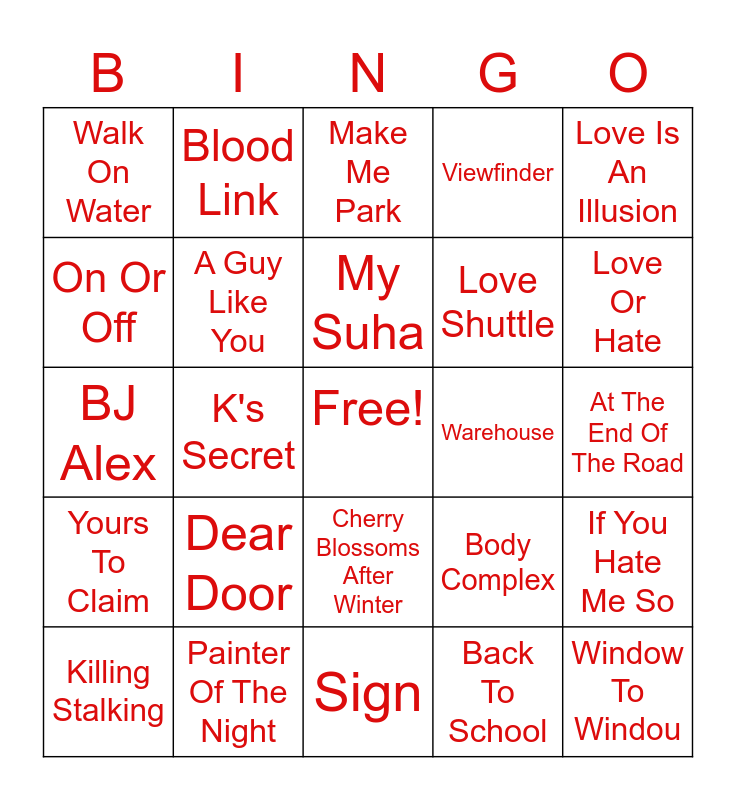 This bingo card has a free space and 24 words: Dear Door, Painter Of The Night, My Suha, Killing Stalking, Love Is An Illusion, Walk On Water, On Or Off, Blood Link, Warehouse, Cherry Blossoms After Winter, Love Shuttle, BJ Alex, Body Complex, If You Hate Me So, A Guy Like You, Back To School, At The End Of The Road, Make Me Park, Love Or Hate, K's Secret, Window To Windou, Yours To Claim, Viewfinder and Sign.